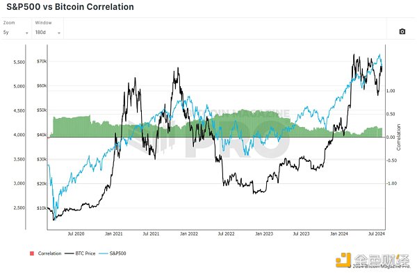 鑒于Bitcoin自身基本因素的影響可能會減弱,新市場參與者的影響增加,以及Bitcoin與傳統資產和指數(如標普500)的歷史上強正相關性,Bitcoin可能會開始跟隨更傳統的市場周期,例如那些通常持續8-10年的股市周期。在下圖中,我們可以看到Bitcoin價格走勢(黑線)與標普500價格走勢(藍線)。