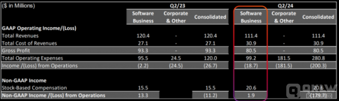 盡管Bitcoin持有量和未實現獲利顯著,微策略的軟體業務仍然虧損。財報顯示,其軟體業務營收同比下降7.5%至1.111億美元,營業虧損達到1,870萬美元。此外,微策略認列了高達1.815億美元的數位資產減損,但未使用公允價值來認列Bitcoin的價值。