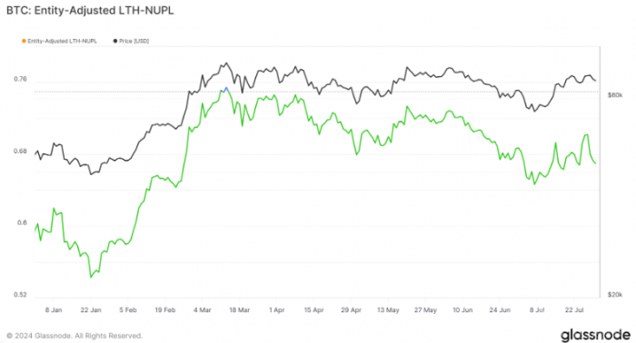 2024年,LTH-NUPL持續保持在0.5以上,表明長期持有者對市場上升趨勢抱有強烈信心。該指數經歷了5月11日至13日的貪婪階段,隨著Bitcoin創下新的歷史新高,表現出短暫的興奮。自7月以來,LTH-NUPL一直呈上升趨勢,波動較大,7月27日達到0.7,7月31日小幅下降至0.66。