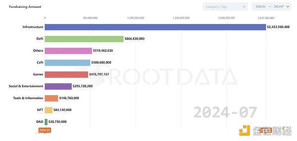 賽道表現(xiàn):以基礎(chǔ)設(shè)施最受投資方青睞,共融得24億美元,遠(yuǎn)超第二名的DeFi8.6億美元。當(dāng)中也能看到VC對(duì)DAO以及NFT興趣缺缺,排在融資金額最后兩位。