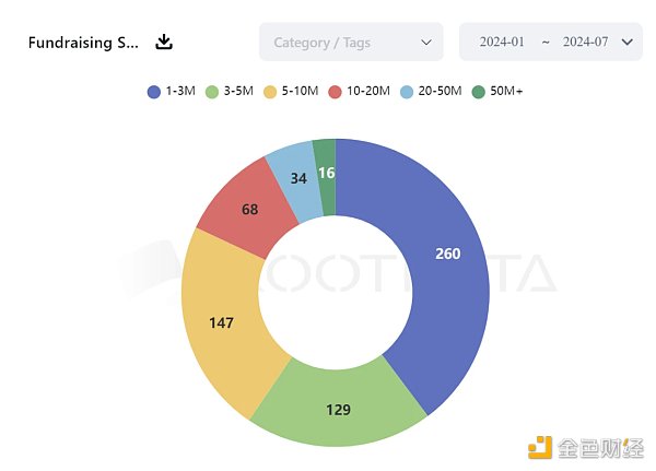 單筆融資規(guī)模: 100~300萬規(guī)模占比40%為最高, 500~1000萬占比22%次之。300~500萬規(guī)模融資相比2023年有所減少,減少的部分增加在100~ 300萬以及500-1000萬區(qū)間,也代表2024項(xiàng)目融得金額中間地帶減少,較為分化。