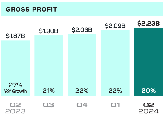 Block的總毛利潤在一年內(nèi)增長了20%,達(dá)到22.3億美元。2024年第二季度,普通股股東可獲得的凈利潤達(dá)到1.95億美元,高于去年的1.02億美元。