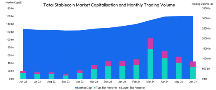 根據Coingecko的數據,Tether的USDT和Circle的USDC在1640億美元的穩定幣市場中占據主導地位,約占90%的市場份額。這顯示了穩定幣在全球范圍內的重要性和廣泛應用。