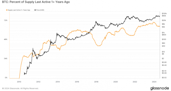 進入2024年以來,長期休眠的Bitcoin供應量顯著下降,反映出市場狀況和持有者行為的變化。從2024年初的約70%下降到7月底的約66%。