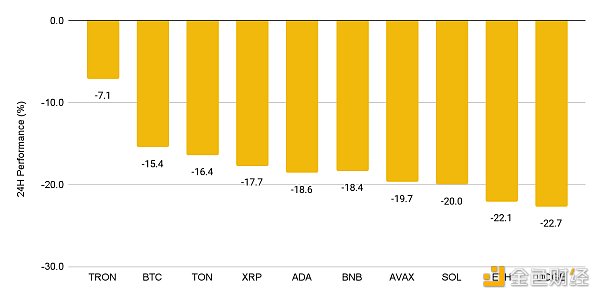 從市值來看頂級Tokens的表現,一個趨勢很明顯:沒有Tokens能幸免于最近的下跌。在前10種非穩定幣、非衍生品資產中,DOGE的24小時表現最差,下跌了22.7%。相反,TRON表現最為強勁,當日下跌7.1%。