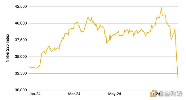 東京股市受到貨幣走強的影響,因為日元自7月中旬以來已升值約12%。此前,日本央行加息,這實際上給從事“套利交易”策略的投資者帶來了很大痛苦(借入利率較低的日元,然后將收益再投資于回報率更高的貨幣,如美元)。日元走強還導致上述投資者償還日元債務而產生拋售壓力,這是導致美國股價下跌的一個因素。