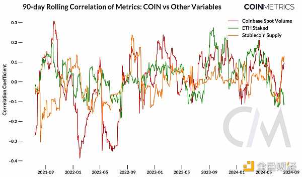 COIN收益與關(guān)鍵指標之間的90天滾動相關(guān)性顯示出顯著的變化,反映了Crypto市場和與Coinbase業(yè)務(wù)相關(guān)的指標的動態(tài)性質(zhì)。在Coinbase作為一家上市公司的早期階段,COIN收益與交易所的現(xiàn)貨交易量呈現(xiàn)出最高的正相關(guān)和負相關(guān)(+0.3至-0.4),表明其對投資者的最初重要性。然而,隨著時間的推移,它與穩(wěn)定幣供應(yīng)和ETH質(zhì)押量變化的關(guān)系也變得越來越突出,盡管這種關(guān)系仍然很弱,這表明投資者的注意力正在逐漸轉(zhuǎn)向新的收入來源。$COIN與市場回報之間的相關(guān)性
