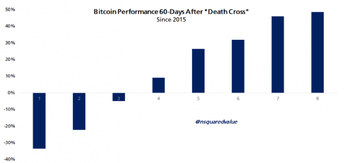 Bitcoin分析師蒂莫西·彼得森分享了一張歷史圖表,顯示了自2015年以來的死亡交叉情況。他指出:“死亡交叉并沒有那么危險?!弊?015年以來,死亡交叉出現了八次,而每次死亡交叉后的兩個月內,Bitcoin價格平均上漲了67%。彼得森還表示,平均回報率為18%。
