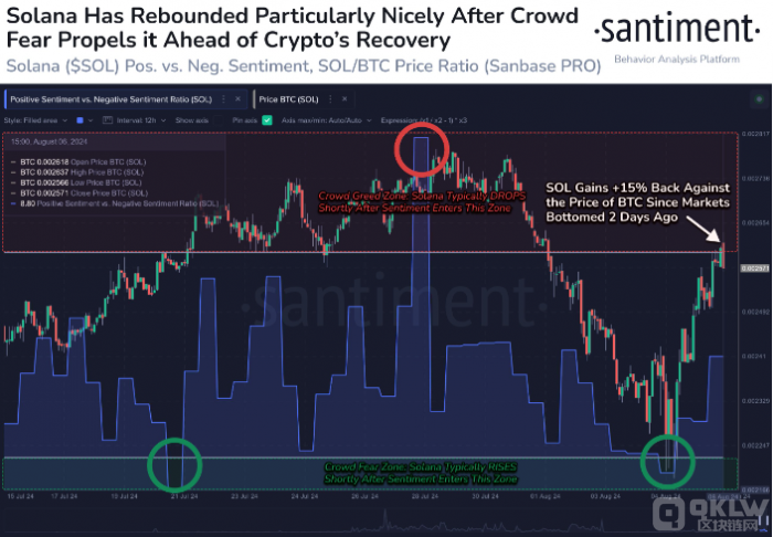 最近幾天,Solana的表現顯著優于其他主要crypto。自8月5日觸底以來,SOL價格相對Bitcoin(BTC)上漲了超過15%。分析師Santiment在社交媒體上評論道:“從市場情緒來看,Solana 是一款表現突出的crypto。如果市場對其持有更多信心,SOL 可能會繼續上漲。”