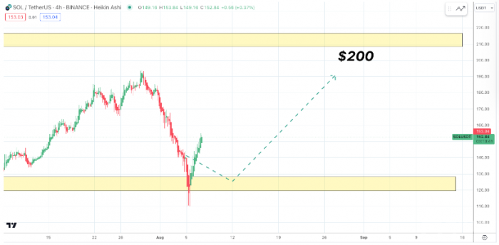 盡管如此,著名分析師Hov在8月6日的分析中警告稱,Solana 必須將148美元轉變為支撐位,否則可能面臨回調至100美元以下的風險。他表示:“SOL 正處于關鍵的技術水平。如果我們能夠維持高位時間框架(HTF)在148美元以上,價格可能會繼續上升至180美元左右?!?/p>