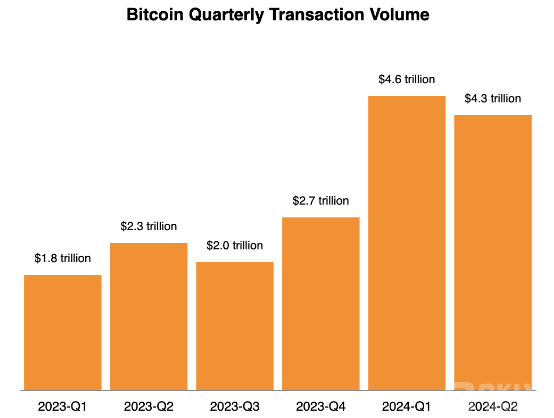 進(jìn)入2024年,Bitcoin的交易量上升趨勢更為明顯。第一季度交易量達(dá)到了4.6萬億美元,第二季度則保持在4.3萬億美元的強(qiáng)勁水平。截至目前,2024年Bitcoin的交易總量已達(dá)8.9萬億美元,這反映出其在全球金融體系中日益增強(qiáng)的影響力和采用率。