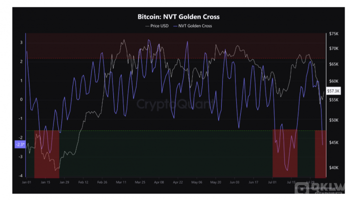 另外,根據(jù)鏈上分析平臺CryptoQuant 8月8日的最新研究,Bitcoin在2024年已經(jīng)第三次發(fā)出“局部底部”信號,市場可能即將迎來反彈。該研究指出,網(wǎng)絡(luò)價值與交易量黃金交叉(NVT-GC)指標(biāo)顯示出看漲趨勢,暗示Bitcoin價格有望回升。