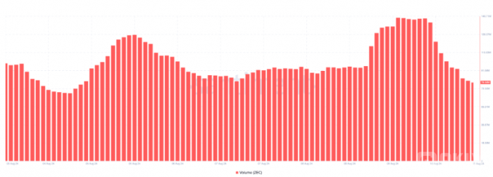 盡管ZEC的價格持續(xù)上漲,成交量卻顯示出相反的趨勢。8月10日的交易量超過1.45億美元,但與年初相比,交易量已下降超過40%。通常情況下,價格上漲伴隨成交量增加是看漲信號。而成交量的減少則可能表明多頭力量減弱,ZEC的價格可能在短期內跌破41美元。