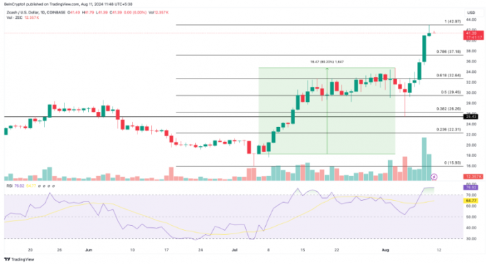 從技術分析來看,ZEC的顯著上漲始于7月,價格從低于18美元飆升至8月3日的34.75美元,隨后回調至25.43美元。盡管價格在近期達到了42.97美元的峰值,但相對強弱指數(shù)(RSI)目前為77.02,表明ZEC已超買,可能面臨回調風險。