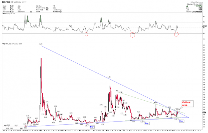 2020年、2022年和2024年均出現過強烈的買入信號,暗示價格有可能走高。目前的周線圖顯示,XRP已經從相對強弱指數(RSI)的中線回調,這進一步暗示了可能的決定性突破。