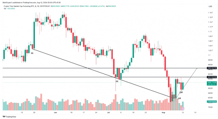 同時,TOTAL2的日線圖顯示出試圖突破下降結構的跡象。從5月到8月初,山寨幣總市值形成了一系列較低的低點,但目前已出現較低的高點,這可能預示著強勁上升趨勢的形成。