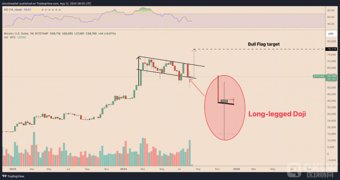 從技術面來看,在Bitcoin每周行情中,十字星蠟燭圖的形成,伴隨著Bitcoin在牛市旗形形態下接近趨勢線時的交易量上升,表明市場對價格反彈的信心正在增強。這可能預示著到9月份,Bitcoin將有機會反彈至旗形的上趨勢線,大約在66,500美元左右。