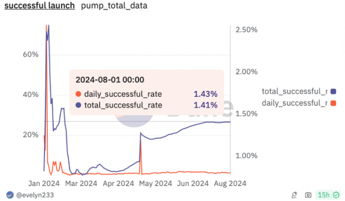 Cinneamhain Ventures 的合伙人 Adam Cochran 在8月1日的社交媒體帖子中指出,Pump.fun 上Tokens的“畢業率”維持在1.4%左右,且沒有新Tokens能突破2000萬美元的完全擴張估值 (FDV) 水平。
