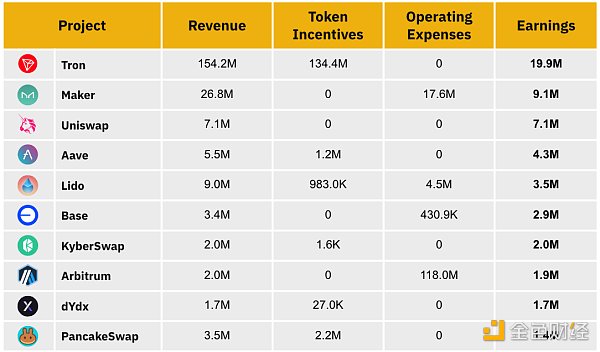 依據最近30天的數據,盈利能力領先的協(xié)議(在TokenTerminal的樣本數據集內)是Tron、Maker和Uniswap。