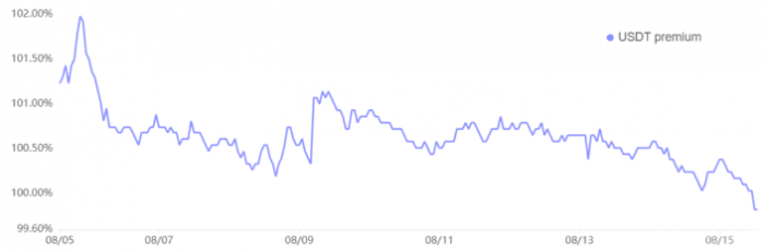 分析cn市場(chǎng)對(duì)穩(wěn)定幣的需求可以進(jìn)一步理解當(dāng)前Bitcoin的市場(chǎng)狀況。通常情況下,強(qiáng)勁的零售需求會(huì)推動(dòng)穩(wěn)定幣的交易價(jià)格較官方美元匯率溢價(jià)2%或更多。最近數(shù)據(jù)顯示,8月15日,Tether(USDT)在cn的交易價(jià)格下跌0.2%,顯示出對(duì)該crypto的需求減弱。與8月6日的2%溢價(jià)相比,市場(chǎng)情緒顯著轉(zhuǎn)變。