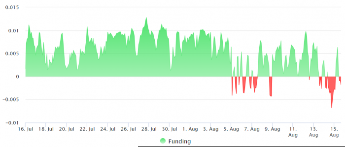 自8月8日以來(lái),BTC一直在窄幅區(qū)間內(nèi)波動(dòng),無(wú)法突破62,000美元,同時(shí)鞏固58,000美元的支撐位。大盤(pán)的整體波動(dòng)反映出交易員收到的信號(hào)日益不確定,尤其是在BTC期貨融資利率仍為負(fù)的情況下,這表明買(mǎi)家的杠桿需求較低。問(wèn)題在于,是否可以?xún)H憑這一指標(biāo)來(lái)決定crypto市場(chǎng)的走勢(shì),或歷史模式是否預(yù)示著即將出現(xiàn)反彈。