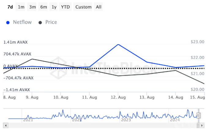 雪崩(AVAX),作為智能合約平臺Avalanche的原生Tokens,也受到鯨魚的青睞。大型持有者的凈流入增加了36%,顯示出鯨魚在積極積累AVAX。AVAX在過去一周價格下跌了5%,這可能與即將于8月19日進行的Tokens解鎖有關。Tokens解鎖通常會導致供應增加,從而引發拋售壓力和價格下跌。但如果解鎖事件后鯨魚繼續增持,AVAX的價格可能會逐漸回升。