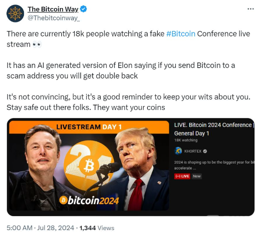 尤其令人擔(dān)憂的是,人工智能生成的假聲音和圖像被廣泛用于詐騙。特斯拉首席執(zhí)行官埃隆·馬斯克的聲音和形象被頻繁使用。6月6日,有超過35個YouTube頻道直播了人工智能生成的假馬斯克聲音,承諾投資者能獲得雙倍回報。Bitcoin咨詢公司The Bitcoin Way在7月27日報告了另一個利用馬斯克聲音的AI騙局。