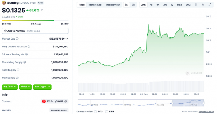 自Sundog上線以來,其市值曾一度攀升至3.25億美元的峰值,目前穩定在1.32億美元。在最近的一次交易中,一位投資者大手筆注資45萬美元,進一步推動了Sundog的價格上漲。