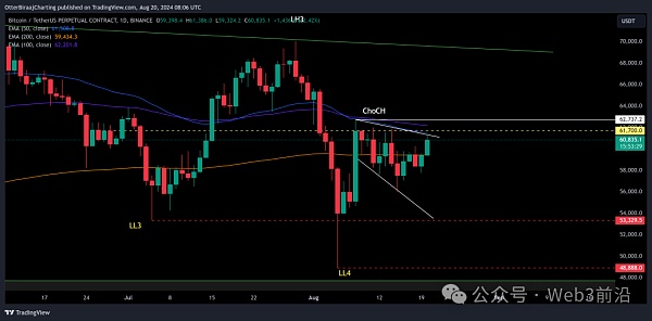 如果Bitcoin能夠突破EMA提供的集體阻力和61,700美元,那么當BTC突破62,737美元上方時,看漲反轉將得到確認。九月,這可能會導致一個名為“ChoCH”或“性格改變”的市場信號——趨勢逆轉的跡象。
