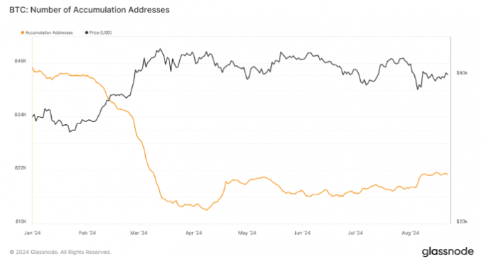 從5月份開始,這些累積地址的數(shù)量開始小幅回升,到了8月份,數(shù)量穩(wěn)定在82.2萬個左右。這一小幅回升反映出長期持有者在減半后對市場波動的謹(jǐn)慎態(tài)度,盡管市場仍存在不確定性。