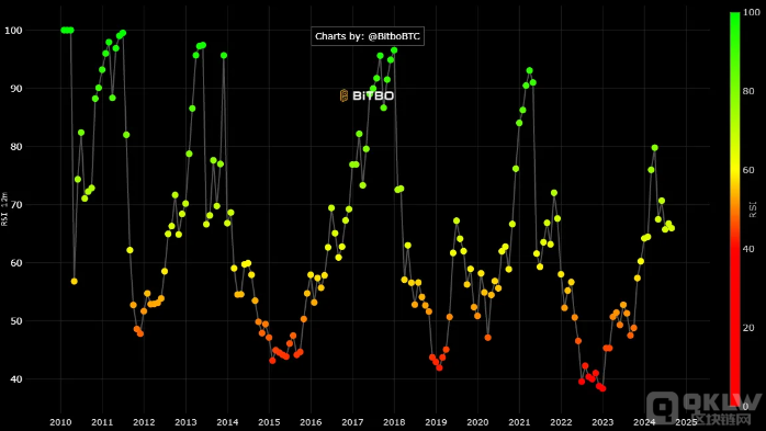 根據(jù)Bitbo數(shù)據(jù),Bitcoin的RSI指數(shù)為66.11。今年3月,BitcoinATH達到73,679美元時,RSI飆升至79.79。
