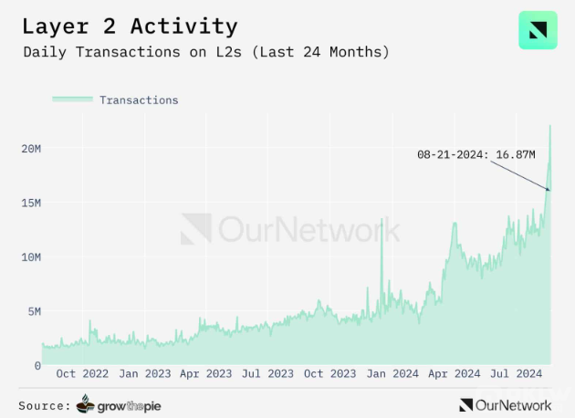 據OurNetwork報道,EthereumLayer 2解決方案的交易量正在前所未有地增長,8月21日的日交易量達到創紀錄的1687萬筆。