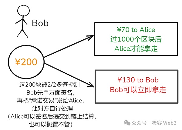 這里我們要注意:這筆承諾交易是Bob主動構(gòu)造的,其中條件對Alice不利,Alice只能接受/拒絕,我們要想辦法留給Alice一些自主權(quán)。在支付通道的設(shè)計中,只有Alice自己能把“對自己不利”的承諾交易放到鏈上觸發(fā),這是因為承諾交易要湊足2/2多簽,Bob在本地構(gòu)造交易后只有自己的簽名,沒有Alice簽名。