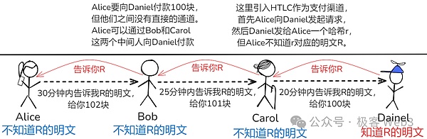 之后的事情不難想象:Carol把密鑰R告訴Bob,拿到101塊錢;Bob再把密鑰R告訴Alice,拿到102塊錢。我們觀測所有人的得失,可以看出Alice失去102塊錢,Bob和Carol凈賺1塊錢,Daniel得到100塊。這里面Bob和Carol賺的1塊錢就是它們從Alice那抽的手續(xù)費。
