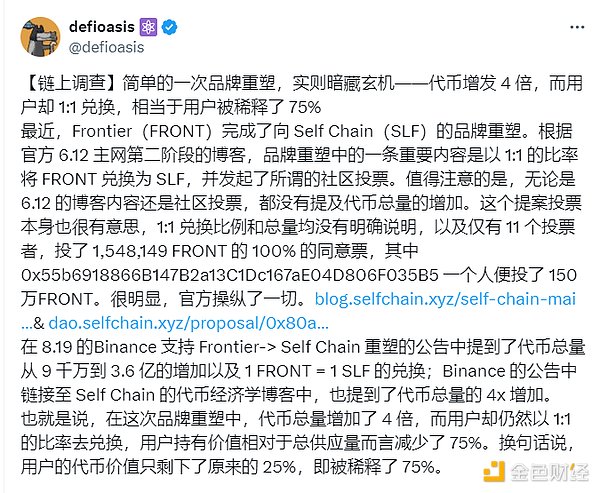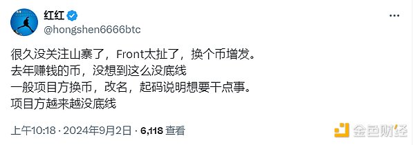 在幣安正式將FRONT更名并上線SLF后,KOL@bitcoin136發(fā)長文表示由于幣安未能在8月19日FRONT更名的公告中明確提及該Tokens會有增發(fā)行為,導致其提前買入而遭受到了資金方面的損失。