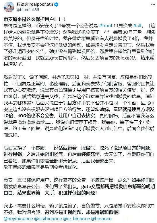 KOL@bitcoin136 發(fā)長(zhǎng)文稱,因幣安在 8 月 19 日 FRONT 更名公告中未提及增發(fā)行為,導(dǎo)致其提前買入遭受資金損失,并貼出與幣安人工客服聊天記錄。幣安表示未將Tokens增發(fā)列入公告,后續(xù)會(huì)優(yōu)化流程。且另一家交易所 gate.io 早前公告中寫明了 FRONT 增發(fā)信息。眾多社區(qū)成員支持 @bitcoin136,指責(zé)項(xiàng)目方和幣安工作疏漏。9 月 1 日,幣安更新公告補(bǔ)充了 SLF Tokens總供應(yīng)量變化,但截至撰文仍未對(duì)缺漏信息作進(jìn)一步說(shuō)明。
