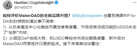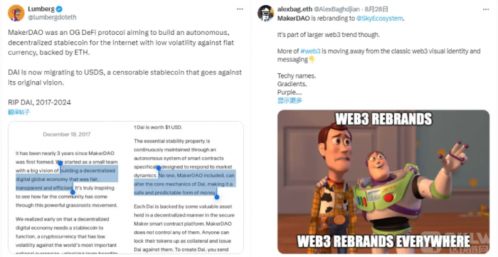 上周,MakerDAO 宣布將其品牌名稱正式更改為 Sky Protocol,并將原有的Tokens和穩(wěn)定幣升級為 SKY 和 Sky Dollar(USDS)。這一舉動迅速引發(fā)了社區(qū)的廣泛討論,尤其是在老用戶中間引起了不少質疑和批評。批評者認為,新的名字缺乏特色,更像是一家 Web2 公司,與 Web3 的Decentralization精神背道而馳。此外,關于原X(推特)賬戶的管理不善也進一步加劇了社區(qū)的不滿。盡管如此,這一改名行動仍然成為行業(yè)內的焦點,尤其是在當今市場環(huán)境下,許多項目都在采用類似的策略,試圖通過品牌重塑來重新吸引市場的關注。