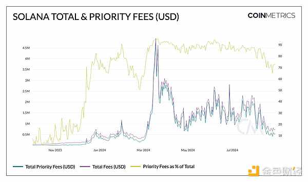 受整體市場和memecoin飆升的推動,Solana的總費用在3月份達到了450萬美元的峰值。此時,優先費用占總費用的95%(自8月以來,這一數字一直保持在80%左右),代表著對交易納入的高需求。然而,活動已顯著減少,目前總費用為73.2萬美元,優先費用為53.3萬美元。采用和使用特征