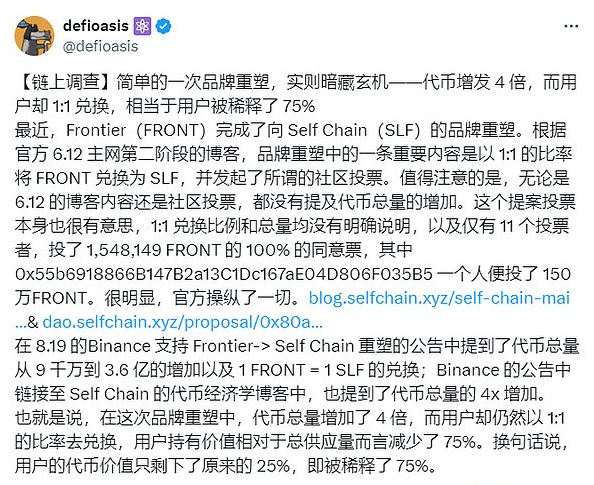 另外,鏈上分析師@defioasis指出,SLFTokens增發4倍,而用戶卻僅按1:1比例兌換,這相當于用戶持有的Tokens價值被稀釋了75%。其他社區成員也紛紛批評項目方和幣安的處理方式,認為這是一種不公平的做法。