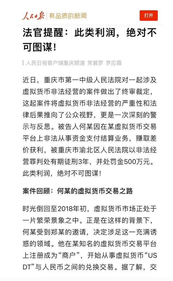 去年年底,廣東省高級(jí)人民法院發(fā)的一則文章(點(diǎn)擊查看原文:《這種差價(jià),不能賺!》),引用了:被告人陳某伙同兩名未到案的嫌疑人,商量以CryptoUSDT作為交易對(duì)象,按美元價(jià)格兌換人民幣。商量好后,陳某在虛擬幣交易平臺(tái)向散戶收購(gòu)USDT,還雇了被告人李某當(dāng)保鏢,護(hù)送自己。2022年2月,在中山市某高速路口,陳某利用手機(jī)與黃某進(jìn)行USDT交易約81.4萬個(gè),按當(dāng)天人民幣與美元的匯率進(jìn)行兌換共計(jì)人民幣510萬余元。結(jié)果,在租車返程途中,陳某、李某在檢查站被公安干警攔截,交易款項(xiàng)被當(dāng)場(chǎng)扣押。大埔縣人民法院一審認(rèn)定,被告人陳某、李某無視國(guó)家法律,利用買賣Crypto的形式變相買賣外匯,情節(jié)嚴(yán)重,已構(gòu)成*非*法經(jīng)營(yíng)罪。公訴機(jī)關(guān)指控的罪名成立,予以支持。