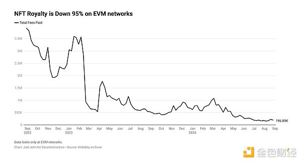 這種模型很有趣,因為它為創作者提供了繼續從作品中獲得版稅的方式,并建立有意義的社區。相比之下,2024年第二季度的meme幣季節則由名人所推動,他們常常談論自己的Tokens,而這些Tokens卻在幾周內暴跌了90%。