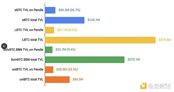 近期,Pendle已陸續(xù)將四種BTCLST集成到其積分市場中,包括$LBTC、$eBTC、$uniBTC和$SolvBTC.BBN。當(dāng)前各LST在Pendle上的流動性和總TVL情況如圖所示。其中,$LBTC的實(shí)際采用情況高于LBTC(Corn)池中的表面數(shù)值。由于37%的$eBTC由$LBTC支持,Pendle對$eBTC的集成也會讓Lombard間接受益,從而使$LBTC持有者擁有更多優(yōu)化收益策略的機(jī)會。