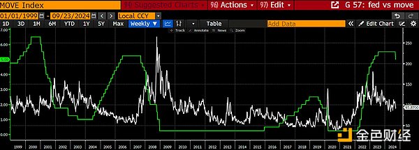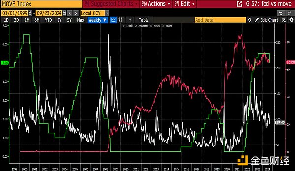 我將要展示的第一張圖表是MOVE指數(shù)(白色),該指數(shù)衡量美國(guó)債券市場(chǎng)的波動(dòng)性與聯(lián)邦基金上限利率(綠色)的關(guān)系。正如你所知,我認(rèn)為數(shù)量比價(jià)格更重要,但在這種情況下,使用價(jià)格來呈現(xiàn)圖景卻極其清晰。