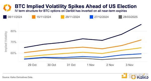 美國大選前的Bitcoin隱含波動率。圖片來源:Kaiko。