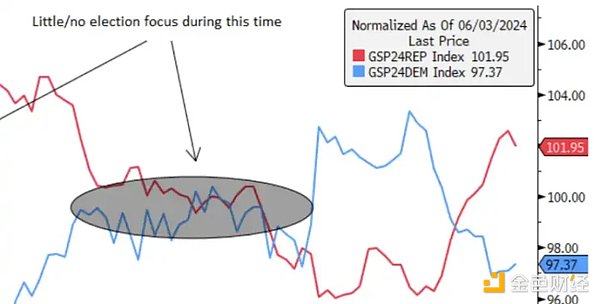 通過對比GSP24DEM和GSP24REP這兩個籃子,可以清晰地看到在哈里斯與特朗普辯論之后,市場對于哈里斯獲勝的信心一度顯得過于自滿。