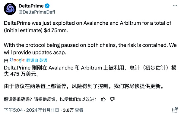 2024年11月15日,基于Aptos的DeFi項(xiàng)目Thala遭攻擊,導(dǎo)致2,550萬美元被盜,攻擊者利用了其智能合約中的漏洞。項(xiàng)目方暫停了相關(guān)智能合約并凍結(jié)了部分Tokens,最終成功凍結(jié)約1,150萬美元的資產(chǎn)。在與執(zhí)法部門和多個(gè)Blockchain安全團(tuán)隊(duì)合作后,項(xiàng)目方成功協(xié)商追回了資產(chǎn),并允許攻擊者保留30萬美元作為賞金。