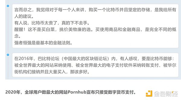 BTC的價值在宏觀領域,從金融史上類比債券、股票,是人類科技新一輪發(fā)展「燃料」;中觀領域,是未來人類必然進入的數字世界的貨幣、也是指數;微觀領域,則是新一輪法律監(jiān)管落地,發(fā)幣合規(guī)化,從而虹吸全世界民間投資需求。