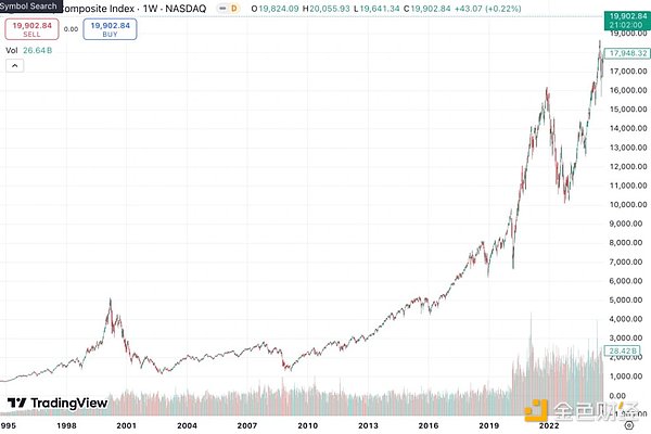 可以把現在的幣圈比作1999年的互聯網時代。在經歷一波走向正軌的快速井噴后,Crypto行業(yè),從2025年末開始,可能會因巨大的泡沫而迎來劇烈調整。回顧歷史,互聯網行業(yè)在1995年12月迎來了Netscape的首次公開募股(IPO),隨后1996年4月雅虎上市引發(fā)了市場的熱潮。2000年3月10日,納斯達克指數觸及歷史巔峰的5408.6點。然而,隨后泡沫迅速破裂,到2001年市場進入寒冬期。盡管廣義的寒冬期持續(xù)至2004年,但真正的低點是在2002年10月,納斯達克指數幾近跌破1000點,從金融角度標志著行業(yè)的最低谷。