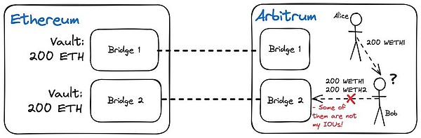 雖然Bob可能期望LayerZero將標準Tokens與原生Tokens的原始設計保持一致,但情況并非總是如此。在最壞的情況下,BobToken在Ethereum上的行為可能與BobToken在Optimism上的行為大相徑庭,因為跨鏈橋提供商實施了一個截然不同的Tokens合約版本——這也給協議的用戶帶來了問題,因為協議開發方和跨鏈橋提供商的目標和利益可能存在分歧。