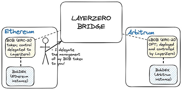 上文關于提供商鎖定的結論部分,強調了使用標準第三方跨鏈橋的另一個問題:Tokens發行方為了獲得更大的便利性和用戶體驗改進,而犧牲了標準跨鏈Tokens的控制權。例如,Ethereum上的BobToken完全在Bob的控制范圍內,因為他控制著底層的ERC-20Tokens合約,但Optimism、Arbitrum和Base上的BobToken卻是由LayerZero控制的,后者擁有在這些Blockchain上發布BobToken標準Tokens的OFT合約。